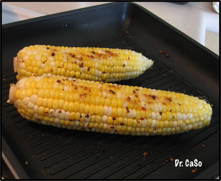 1. J’ai fait grillé deux épis de maïs frais après avoir enlevé les feuilles (husk, en anglish) et la barbe (silk, en anglish) à feu moyen pendant environ 20 minutes, en les retournant de temps en temps. A la dernière minute, j’ai rajouté quelques pignons de pin dans la poêle pour les faire un peu griller.