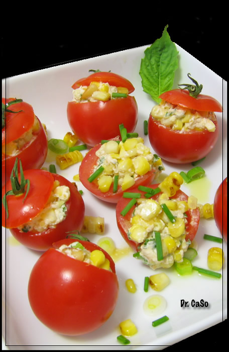 4. Finalement, j’ai rempli les tomates du mélange de maïs et chèvre et ai mis le tout au frais 30 minutes avant de servir avec une vinaigrette bien relevée. (PS. c’est encore meilleurs le lendemain).