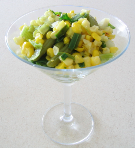 Pour faire cette “ratatouille” amusante, il suffit de prendre quelques haricots verts cassés en deux et de les faire cuire 5 minutes dans de l’eau chaude (ou à la vapeur, c’est encore meilleur mais là il faut les cuire un peu plus longtemps). 2 minutes avant la fin de la cuisson, ajouter des grains de maïs frais (si vous utilisez du maïs en boîte, ne le rajouter qu’à la fin, juste avant de servir le plat). Pendant que les haricots cuisent, faire doucement revenir un ou deux poireaux coupés en fines lamelles dans un peu d’huile d’olive (avec un petit oignon de printemps si vous en avez). Quand ils sont un peu ramolis et transparents, rajouter les haricots et le maïs égouttés (ou le maïs en boîte si c’est ce que vous utilisez). Saler, poivrer, mettre un petit peu de piment séché si on veut, bien mélanger le tout avec une petite cuillère de beurre juste pour donner le goût subtile, décorer de persil, et servir bien chaud avec du poisson ou de la viande ou des pâtes ou du riz ou tout seul…