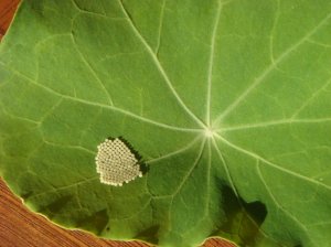 Des oeufs de -je sais pas quoi- sur une feuille de capucine. !Béo!