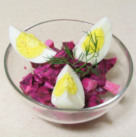 Pour cette petite salade rapide et facile à faire (pour 2-3 personnes), j’ai tout simplement coupé trois grosses betteraves rouges cuites en petits cubes, 1/2 petite oignon très finement, et un demi concombre en petits cubes, et j’ai fait cuire deux oeufs. La vinaigrette était un mélange de yahourt avec un peu de vinaigre et un petit filet d’huile d’olive, du sel, du poivre, et de l’aneth fraîche. Quand les oeufs étaient durs, je les ai laissé refroidir avant de les couper en quartiers pour décorer la salade.