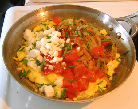 Pour cette jolie omelette, inspirée par l’Obam’lette de Dorian, j’ai d’abord fait griller à feu moyen un gros oignon coupé en fines rondelles pendant une vingtaine de minutes (en rajoutant une petite cuillère de sucre à la fin, pour faire caraméliser le tout). Ensuite, j’ai fait rapidement griller une tomate coupée en petits morceaux, juste pour en faire sortir le jus, pendant environ 2 minutes. Finalement, j’ai fait une omelette normale et ai rajouté par-dessus, quand elle était presque cuite, les oignons, les tomates, un peu de feta en morceaux, et un peu de ciboulette.
