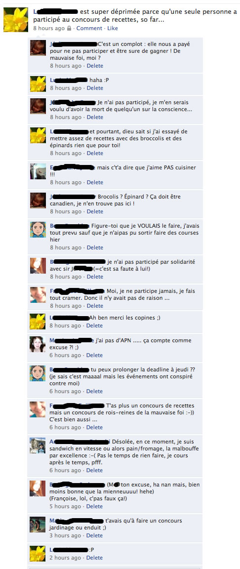 Il est bien connu que Fesse Bouc c’est le mal, mais parfois ça me fait bien rigoler quand-même! Voilà les messages échangés hier après que j’ai osé me plaindre que je n’avais (à l’époque) reçu qu’une recette pour mon concours: