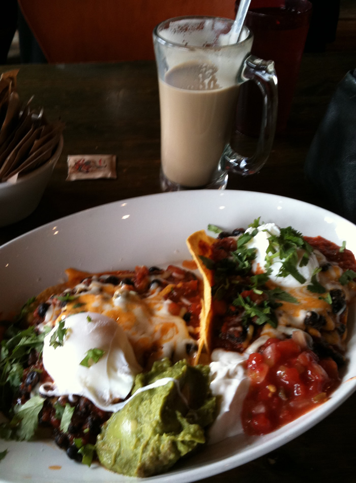 A midi, quand j'ai des tas de copies à corriger comme aujourd'hui, je vais souvent manger des "huevos rancheros" au Sugar Bowl, avec un "small latte." Tortilla, beans, cheese, sour cream, salsa, guacamole, cilantro, et oeufs pochés. Assez pour me servir de p'tit dèj, déjeuner, et diner! Miam!