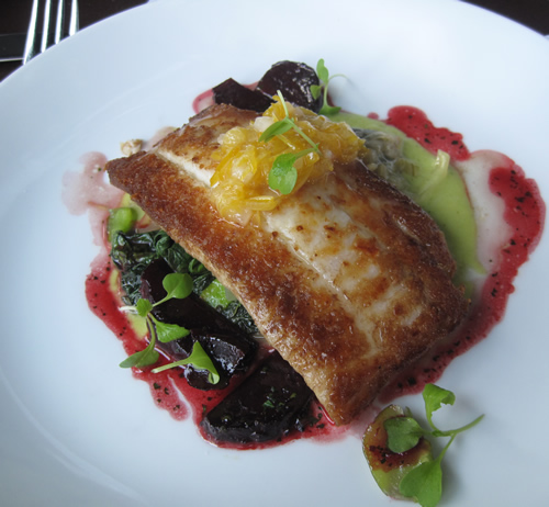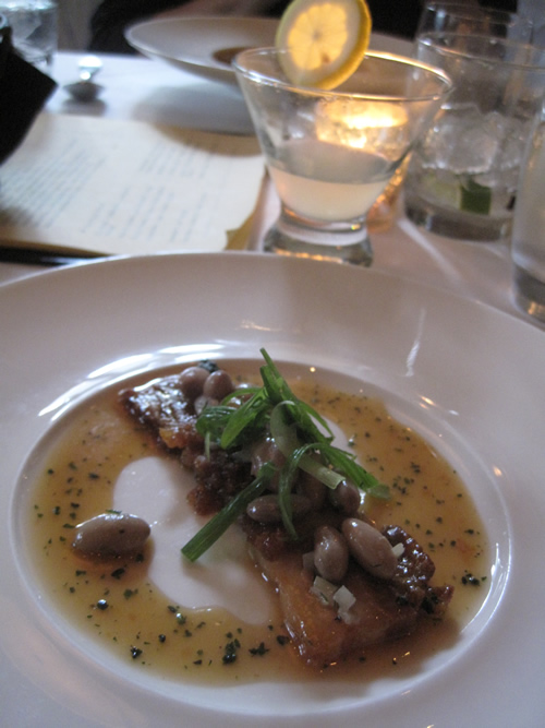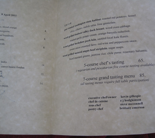 Vendredi soir, donc… qu’est-ce qu’on a rigolé! Quand Germaine (qui est d’un certain âge) m’a demandé où on allait manger, je lui ai expliqué l’histoire en me sentant un peu idiote, mais elle s’est écriée qu’elle connaissait très bien Top Chef et que Kevin était son chef préféré de toutes les saisons et que c’était génial d’aller dans son restaurant! On a rigolé comme des adolescentes pendant toute la soirée! J’ai donc eu un peu moins honte de jouer les fans et de demander un autographe à Kevin et de vouloir lui serrer la main et lui faire la causette! Et franchement, Kevin a été génialement sympa, nous a parlé gentillement pendant au moins dix minutes, a signé nos menus, et s’est laissé prendre en photo! Germaine et moi on était enchantées et ravies! Et en plus de ça, le cadre était très sympa, les serveurs agréables et serviables mais pas obséquieux, et la bouffe était excellente (et le limoncello martini aussi!!!) (et le dessert m’a encore plus fait rigoler)! C’était une soirée absolument parfaite et qui valait bien à elle seule les… hum… $2500 dépensés pour cette conférence à la noix!