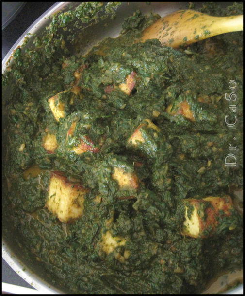 Dans une casserole, mélanger la purée d’épinards avec le masala (moitié moins de masala que d’épinards) puis ajouter les cubes de paneer (frais ou surgelés) (environ 8 cubes par personne) et un peu de sel ainsi qu’une pincée de garam masala. Bien mélanger et couvrir. Laisser mijoter à feu moyen pendant 10-15 minutes (en vérifiant que ça ne crame pas) jusqu’à ce que tout soit bien chaud et décongelé.