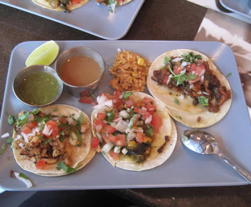 Il y a des tacos au boeuf mariné, au poulet, aux légumes grillés, au porc, et à plein d’autres choses, accompagnés de sauce verte un peu piquante et d’un petit bol de haricots, ainsi que du riz.