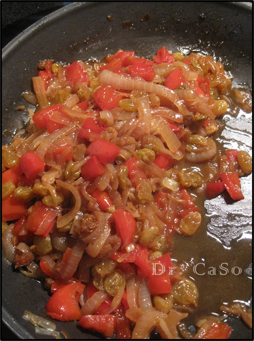 Quand je suis rentrée de Louisiane, il me restait encore trois raisins secs et un poivron rouge dans le frigo. J’en ai profité pour faire ces “poivrons doux à l’oriental” de mon enfance que j’aime beaucoup de temps en temps, malgré le fait que je ne suis pas fan des plats sucrés-salés. Les proportions sont pour 2 personnes.