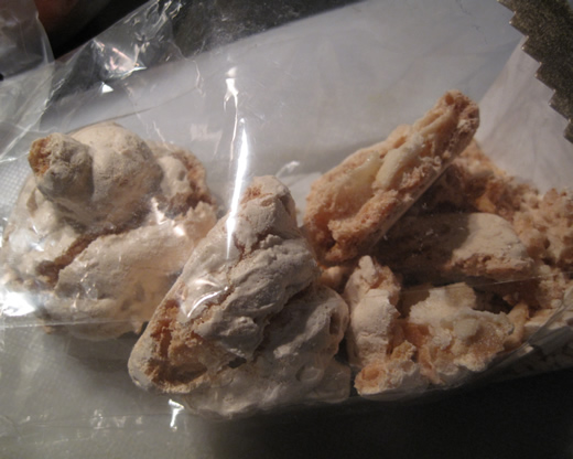L’autre jour, au marché, j’ai eu une soudaine fringale pour quelque chose de sucré et justement, j’étais devant le stand de Queen of Tarts… J’ai acheté un truc qui ne coûtait pas les yeux de la tête, des meringues, même si elles avaient une drôle de tête… Et quand j’ai croqué dedans, j’ai eu la grande joie de tomber sur… des amandes effilées légèrement grillées! A l’intérieur! Visiblement, ils avaient mis une cuillère de blancs d’oeufs puis quelques amandes effilées puis une deuxième cuillère de blancs d’oeufs par-dessus, ce qui avait donné aux meringues leur drôle de tête mais un goût et une texture absolument fantastique!