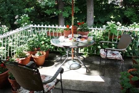 Ma terrasse, seulement 25 minutes du centre-ville de Montréal en ‘commuter train’ mais un petit coin de paradis verdoyant où il fait bon vivre. Fabulous Fabs.
