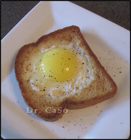 L’oeuf au plat cuit dans un cercle coupé dans une tranche de pain, comme ça, s’appelle un egg in a basket, ou toad in a hole (ces noms sont ceux que j’entends le plus souvent, mais il y en a plein d’autres).