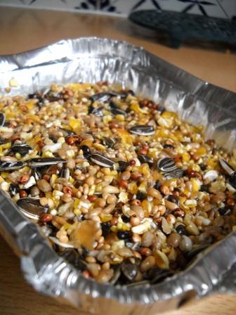 Un truc utile pour les oiseaux: des graines mélangées à du gras de pot au feu. Babeth59.