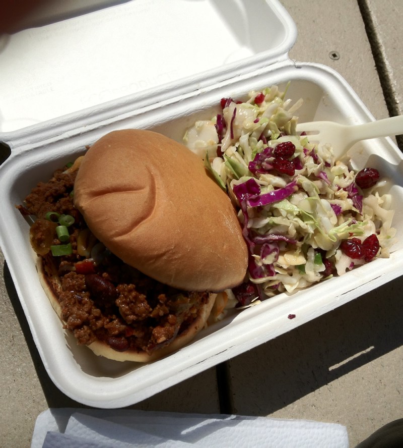Comme j’étais d’une humeur de chien ce jour-là, j’ai choisi le sloppy joe au lieu du sage curry massaman. Le sloppy joe c’est un sandwich rempli de viande hachée dans une sauce genre BBQ et qui se mange très salement (d’où le nom). Là, la sauce était remplie de légumes et vraiment très bonne! Le coleslaw qui l’accompagnait (avec des cranberries séchées sur le dessus) était aussi assez bon (j’ai mangé les cranberries séparément à la fin, comme dessert).