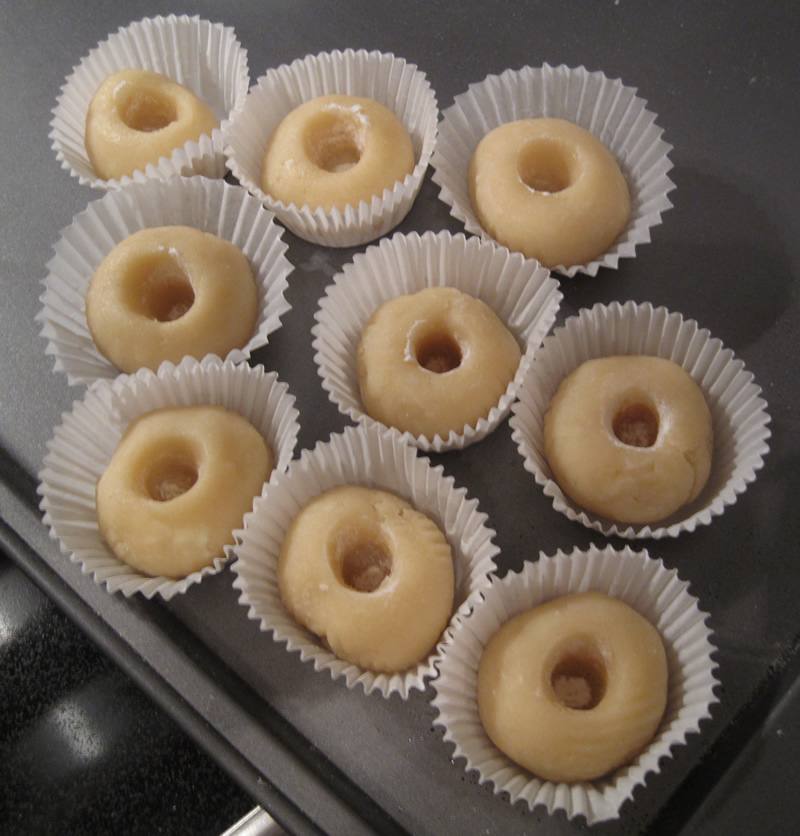 Ensuite, avec le manche d’une cuillère en bois (rond), faire des petits puits dans les boules de pâtes comme sur ma première photo. Il ne faut pas entièrement trouer les billes sinon la confiture va couler! Mettre la confiture dans ces petits trous (mais il ne faut pas que ça déborde parce que ça va bouillir un peu et devenir moche sinon. J’ai pris un petit sac à sandwich et ai mis ma confiture dedans, puis j’ai coupé un petit coin du sac pour en faire sortir un tout petit peu de confiture à la fois.