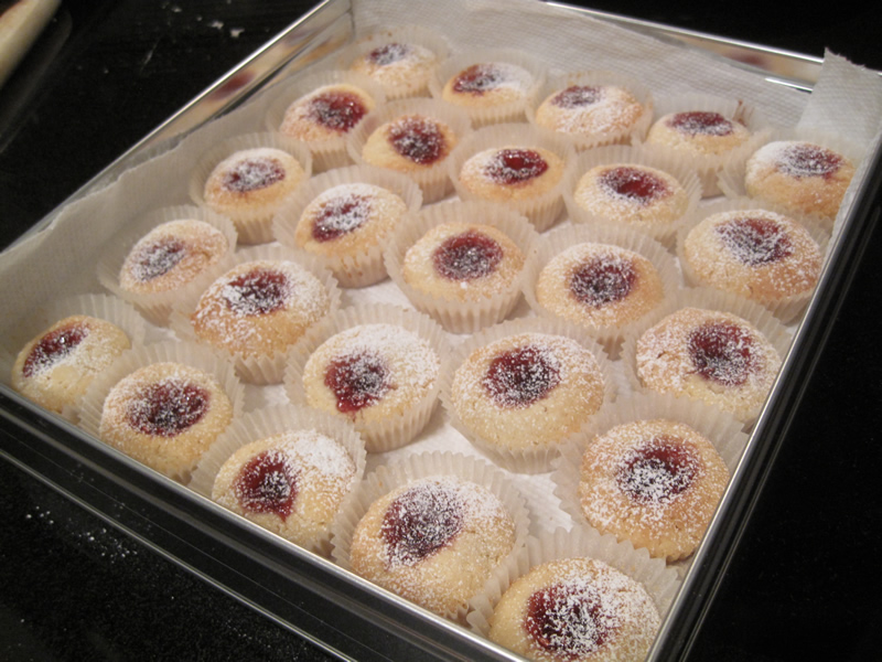 Ces jolis biscuits à la confiture de framboises viennent du bouquin The Williams-Sonoma Backing Book. J’ai divisé les quantités par deux (je vous mets ce que moi j’ai fait).