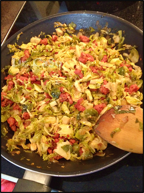4. Pendant ce temps, couper envion 1/3 kilo de choux de Bruxelles très finement et les ajouter sur la viande dans la poêle, ainsi qu’1/2 verre d’eau, et couvrir le tout avec un couvercle. Laisser mijoter à feu moyen pendant 10-15 minutes pour cuire les choux de Bruxelles (qui vont cuire à la vapeur).