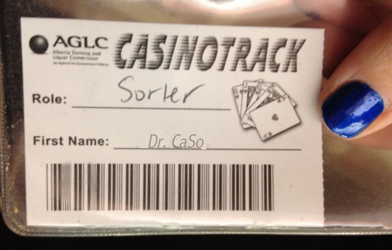En Alberta, 40% de l’argent des casinos est distribué à des associations caritatives, des groupes religieux, etc. Pour avoir droit à cet argent, il suffit de donner gratuitement de son temps à un casino pendant deux jours. Donc des membres de l’association en question (donc, dans mon cas, les amis de l’Alliance française d’ATPN) se portent volontaires pour travailler pendant 48 heures. Nous, on a fait la journée et la nuit de jeudi et vendredi.