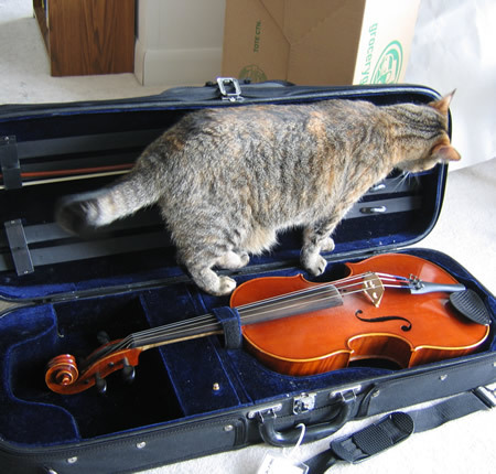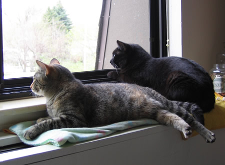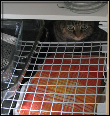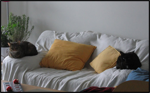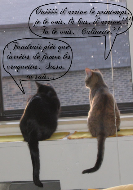 “J’en avais assez de voir le regard implorant de ma Calinette qui voulait jouer pendant que moi je devais bosser… et je me suis dit qu’elle avait besoin d’une compagne de jeu. Ainsi, j’ai décidé d’aller au Animal Shelter (SPA) qui, si vous vous souvenez bien, se trouve de l’autre côté de ma rue, et d’adopter un chat. Pas un PETIT chat parce que je n’ai pas le temps de prendre soin d’un bébé, mais un chat sympa qui jouerait avec ma chouchoutte de Calinette.