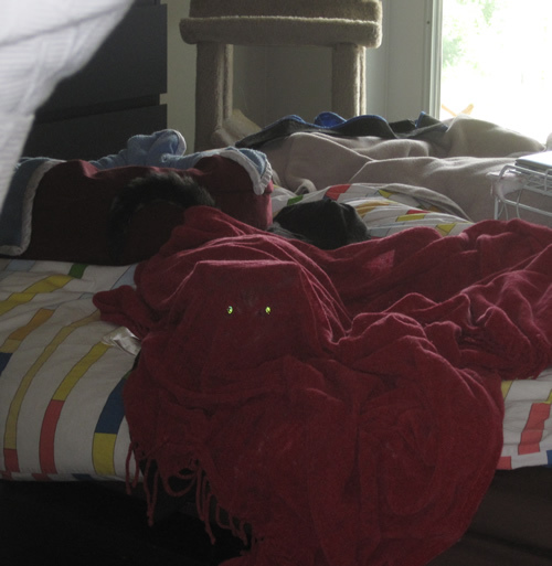 Je ne sais pas ce qui s’est passé (j’ai dû trop la forcer à marcher ces derniers temps, ou on a joué trop énergiquement), mais mardi matin elle ne m’a pas réveillée pour sa nourriture comme d’habitude, elle n’a pas courru se cacher dans une voisine est passée me voir, elle ne m’a pas fait de câlins comme d’habitude… Et quand je l’ai vue marcher, j’ai su que ça ne pouvait plus durer. Elle ne pouvait simplement plus utiliser sa patte arrière droite et pouvait faire à peine deux pas avant de tomber, et elle n’arrivait plus à sauter sur mon lit où elle passait d’habitude ses journées à dormir.