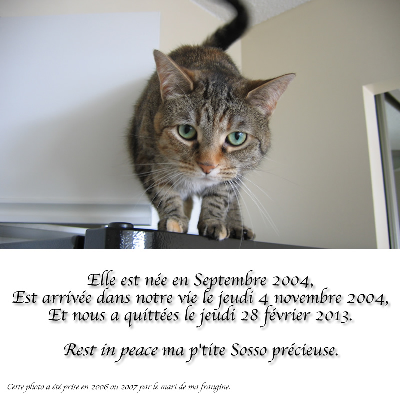 Si dur que soient ces moments et les jours qui suivront, si grande soit ta peine, n’oublie jamais que tu as pris la bonne décision, celle d’arrêter ses souffrances contre lesquelles rien n’était possible. Je repense à mon chat tant aimé, Jazz, que j’ai vu naitre et mourir, et je sais que ton chagrin s’atténuera, et que les bons souvenirs d’une Sosso enjouée referront surface pour chasser ceux terribles des derniers instants. Ce soir mes pensées vont vers toi et Calinette.