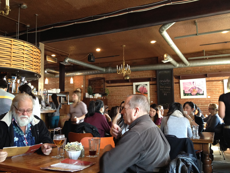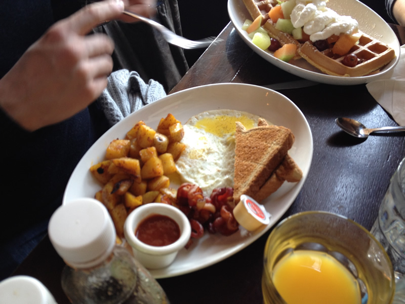 Ce matin, après un réveil en douceur (pour les jeunes, “se réveiller tôt” veut dire se réveiller vers 9 heures du matin et glandouiller jusqu’à 11 heures bien tassées, ah les jeunes!), nous sommes allés dans un magasin de vélos parce que mon cousin aime les vélos, puis nous avons “brunché” au Sugar Bowl, sur le campus.