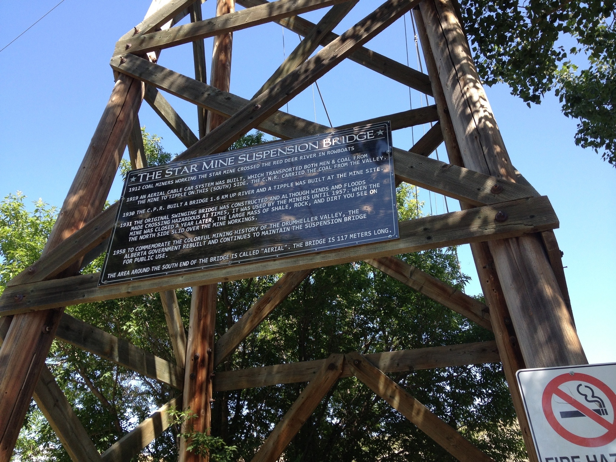 Ce pont suspendu de 117 mètres a été construit en 1931 pour permettre aux mineurs de la mine de charbon Star (ouverte en 1912) de traverser la red Deer river. La mine a fermé en 1957 mais en 1958, le gouvernement de l’Alberta a reconstruit le pont qui avait été détruit part des inondations et des effondrements de la mine juste après sa fermeture, pour commémorer cette mine.