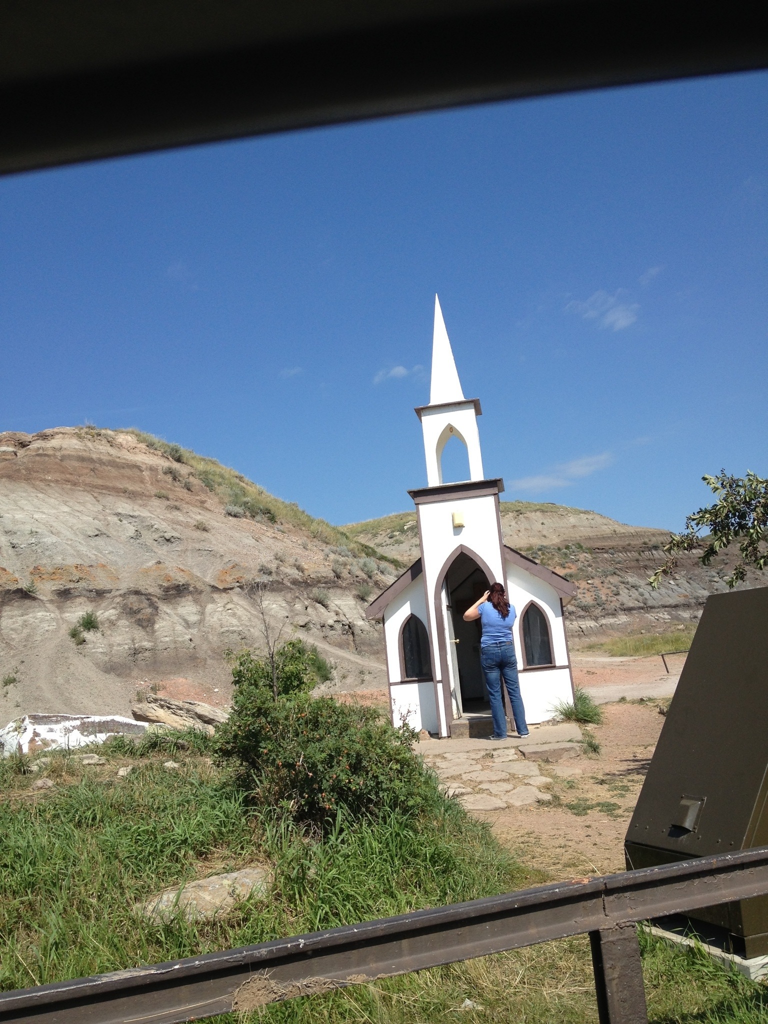 Après le superbe musée sur les dinosaures (et pourtant ce genre de chose n’est pas ma passion) (et après notre visite du Horse Thief Canyon qu’il faut encore que je vous raconte), et avant d’arriver aux fameux hoodoos, Valvita et moi nous sommes arrêtées pour visiter une minuscule église pouvant contenir seulement six personnes (la deuxième et la quatrième photo ont été prises par Valvita. Cliquez sur les photos pour les voir en plus grand comme d’habitude).
