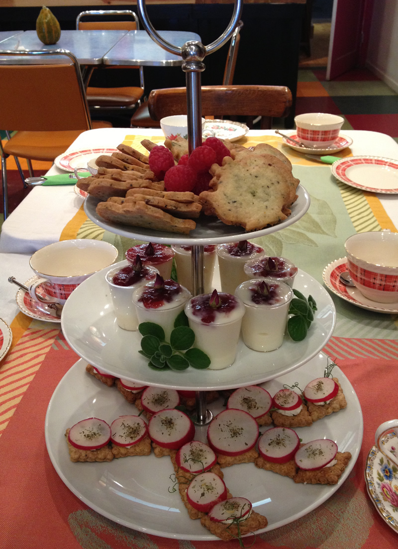 Il y avait des petits sandwiches au concombre (avec du zeste de citron dedans, miam!), des petits biscuits au thé absolument délicieux, des petits bidules aux chèvre et radis, des petits puddings, des petites meringues, et bien sûr les scones célèbres de Cally.