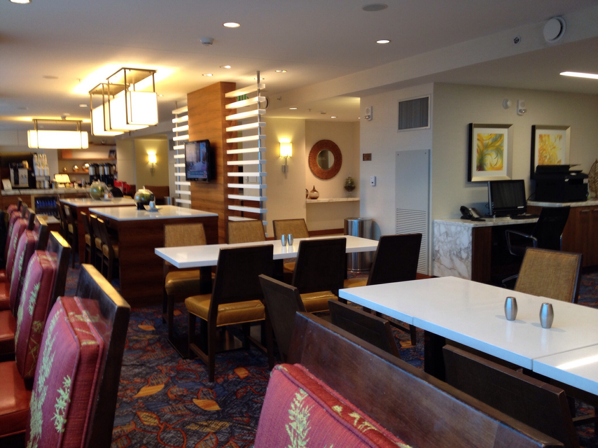 La chambre qu’on a reçue étant très loin des ascenseurs et juste en face des machines à air conditionné de l’hôtel, Susan est allée râler et demander une nouvelle chambre. Comme l’hôtel a mis au moins 15 minutes avant de nous trouver une nouvelle chambre, ils se sont excusés en nous offrant 1) le parking gratuit ($40/jour), Internet gratuit ($15/jour), et accès au lounge du 31ème étage où il y a de la bouffe gratuite toute la journée, une vue superbe, des tables pour étudier et des sofas confortables pour se reposer! Tout ça parce qu’on voulait une meilleure chambre!