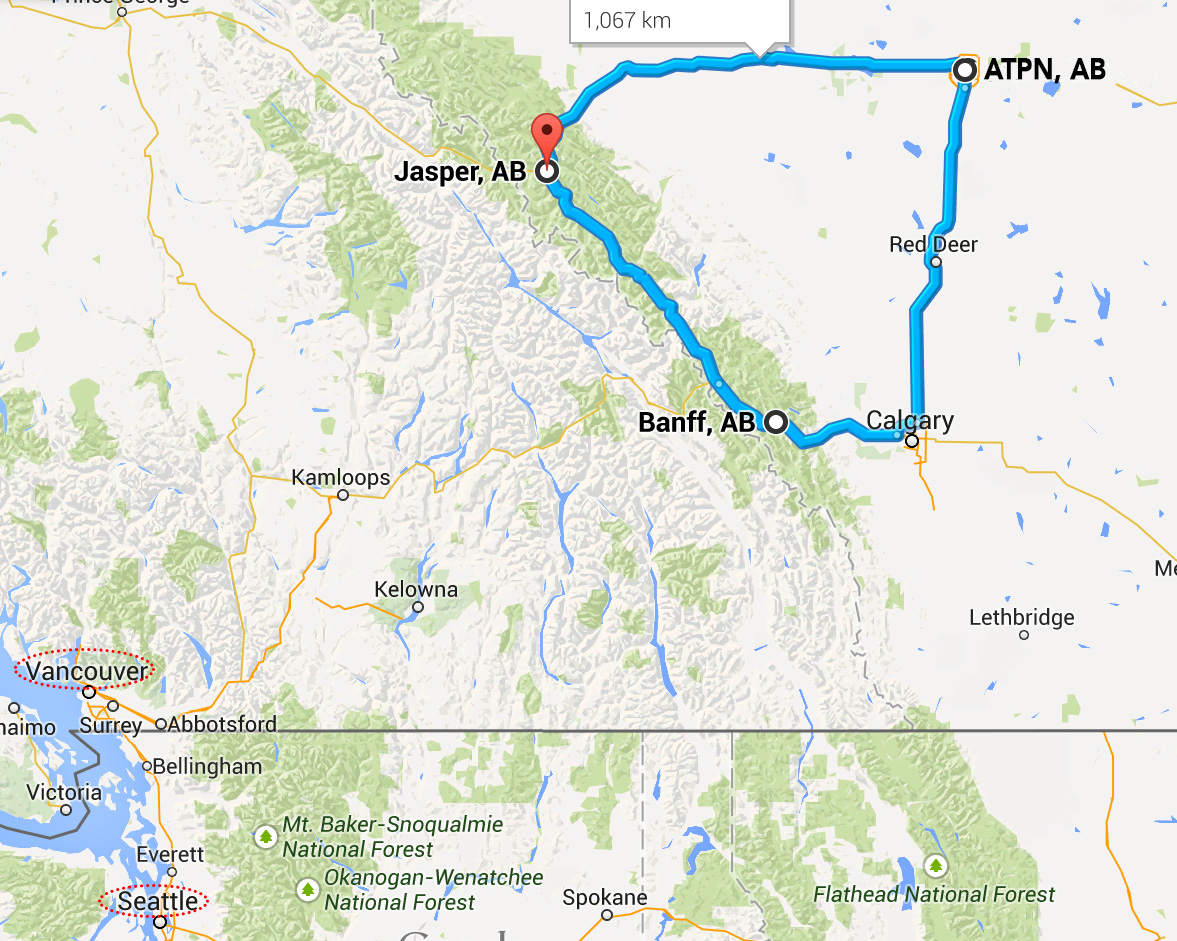 Petite carte pour savoir où tout ça se trouve. Vancouver et Seattle en bas à gauche. 1067 km c’est le cercle en entier.