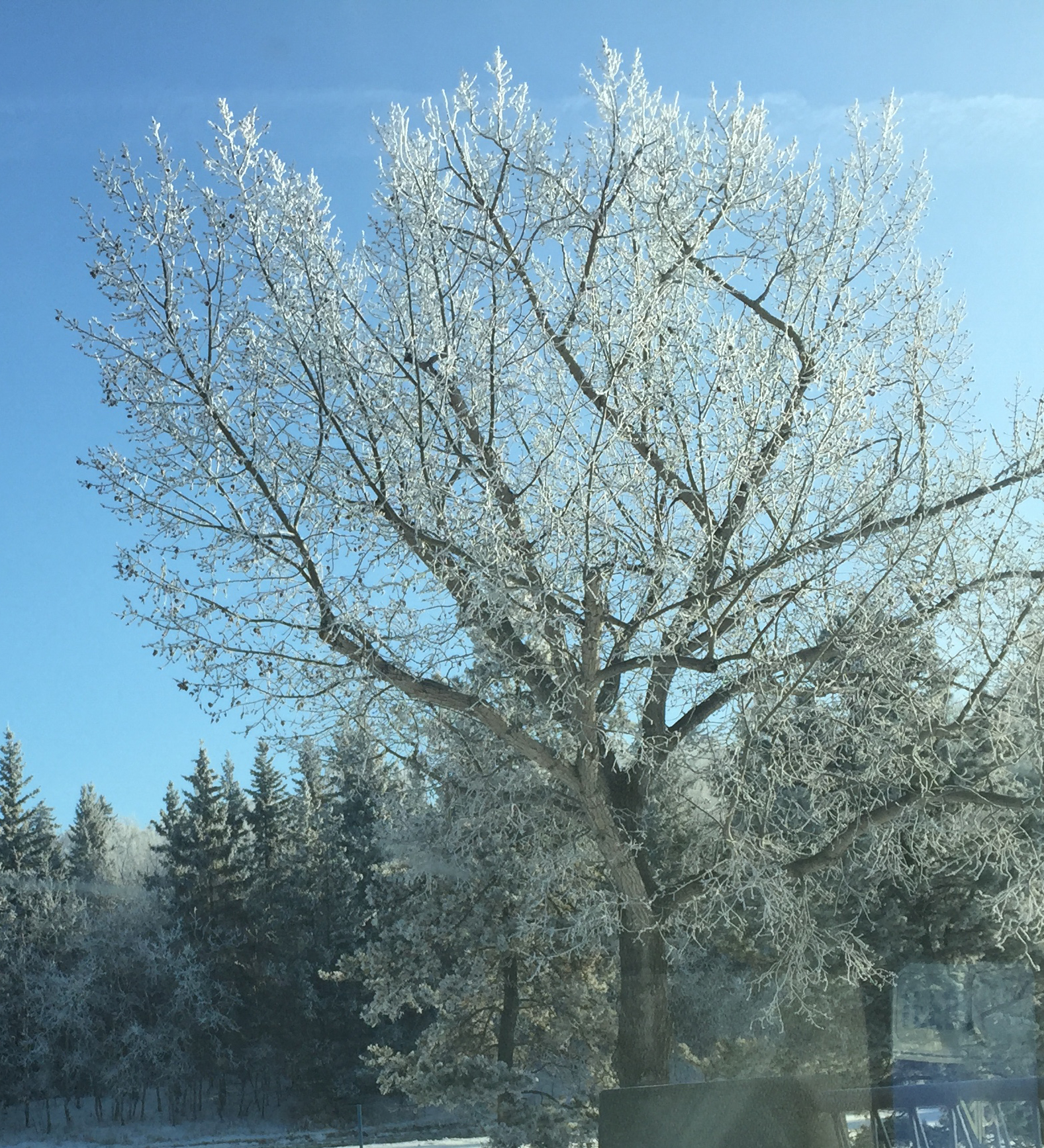 J’ai vu des choses sublimes à ATPN, des tempêtes de diamants, une rivière geler entièrement, une rivière qui fume, des sundogs, une autoroute hivernale pour les animaux, une température de -46,8ºC, et beaucoup, beaucoup de journées frigorifiantes mais éclatantes de soleil (et j’ai aussi réussi à noyer mon réservoir d’essence, et senti mes poils du nez geler beaucoup trop de fois, et ça, c’est VRAIMENT désagréable!), mais là, ce phénomène du brouillard glacé qui se colle à tout est une nouvelle carte à ma collection. Avec le soleil, les cristaux de brouillard gelé éclatent de mille feux, et dans la brume, le sentiment de ce brouillard de glace est mystérieux, cotonneux, complètement magique, comme si on était dans un doux duvet de plumes de diamants.