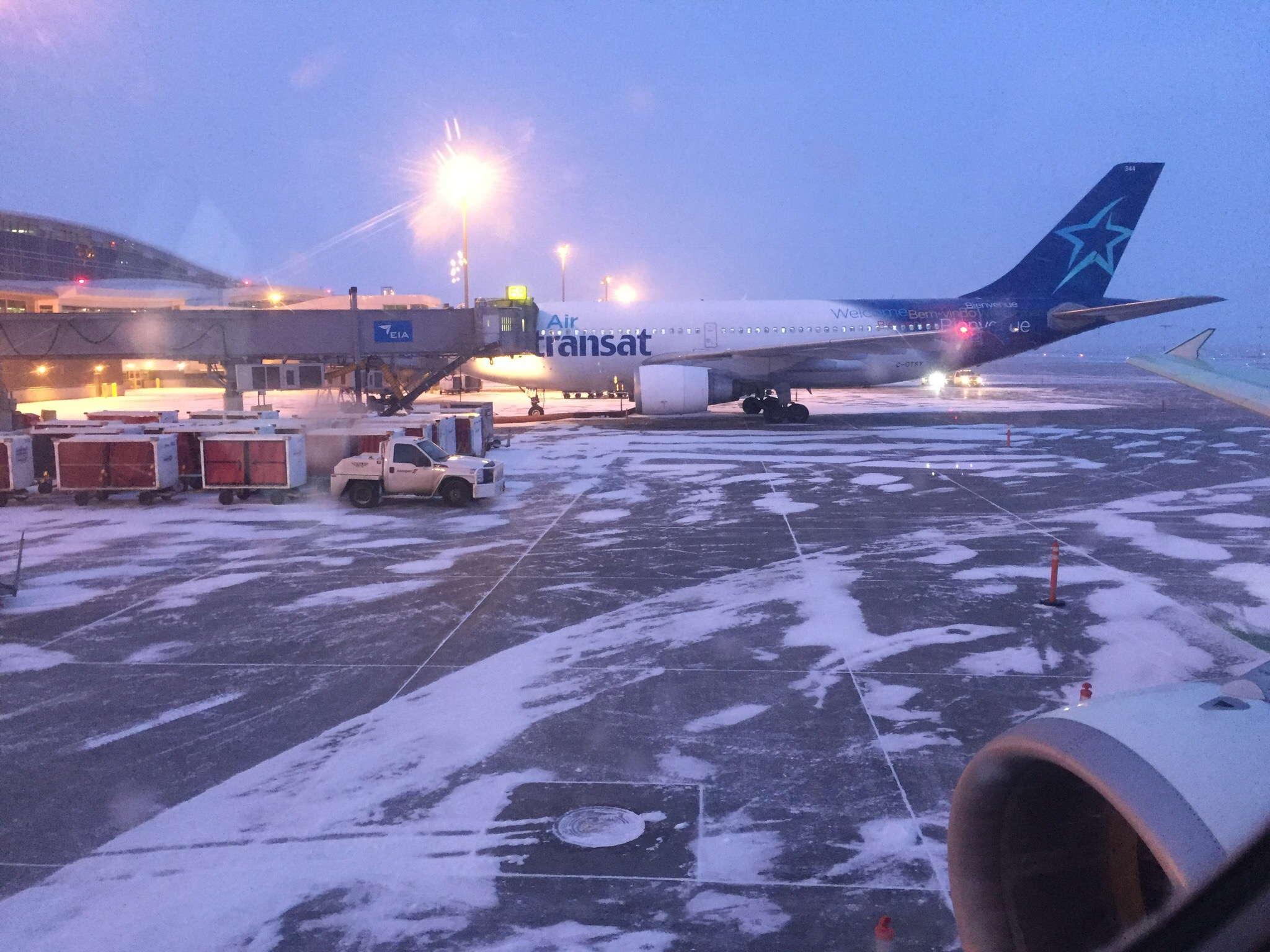 • Été coincée dans l’avion d’abord 45 minutes pour en décongeler les ailes puis encore presque trois heures parce que l’ordinateur de bord ne marchait pas avant d’être reconduite à la porte d’embarquement