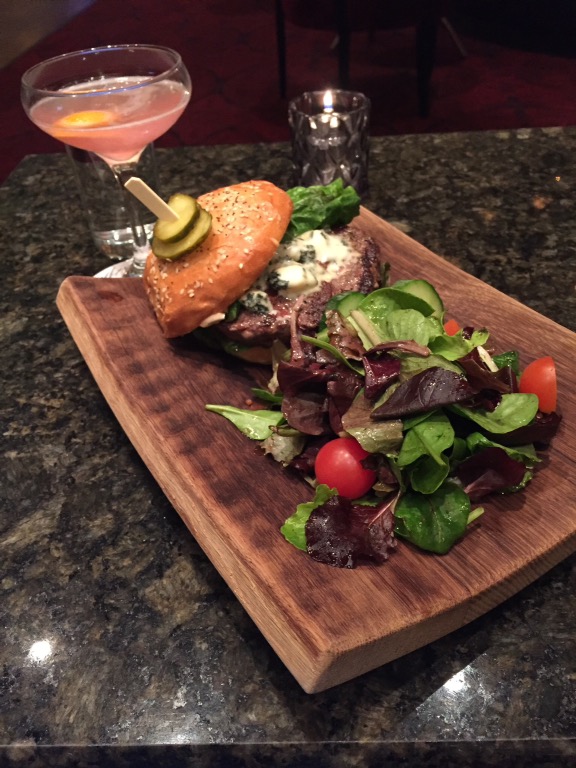 • Rapidement dîné (mais d’un délicieux hamburger pas trop cuit comme les hamburgers canadiens et un bon cocktail) avant de m’effondrer sans avoir réussi à lire quoi que ce soit !