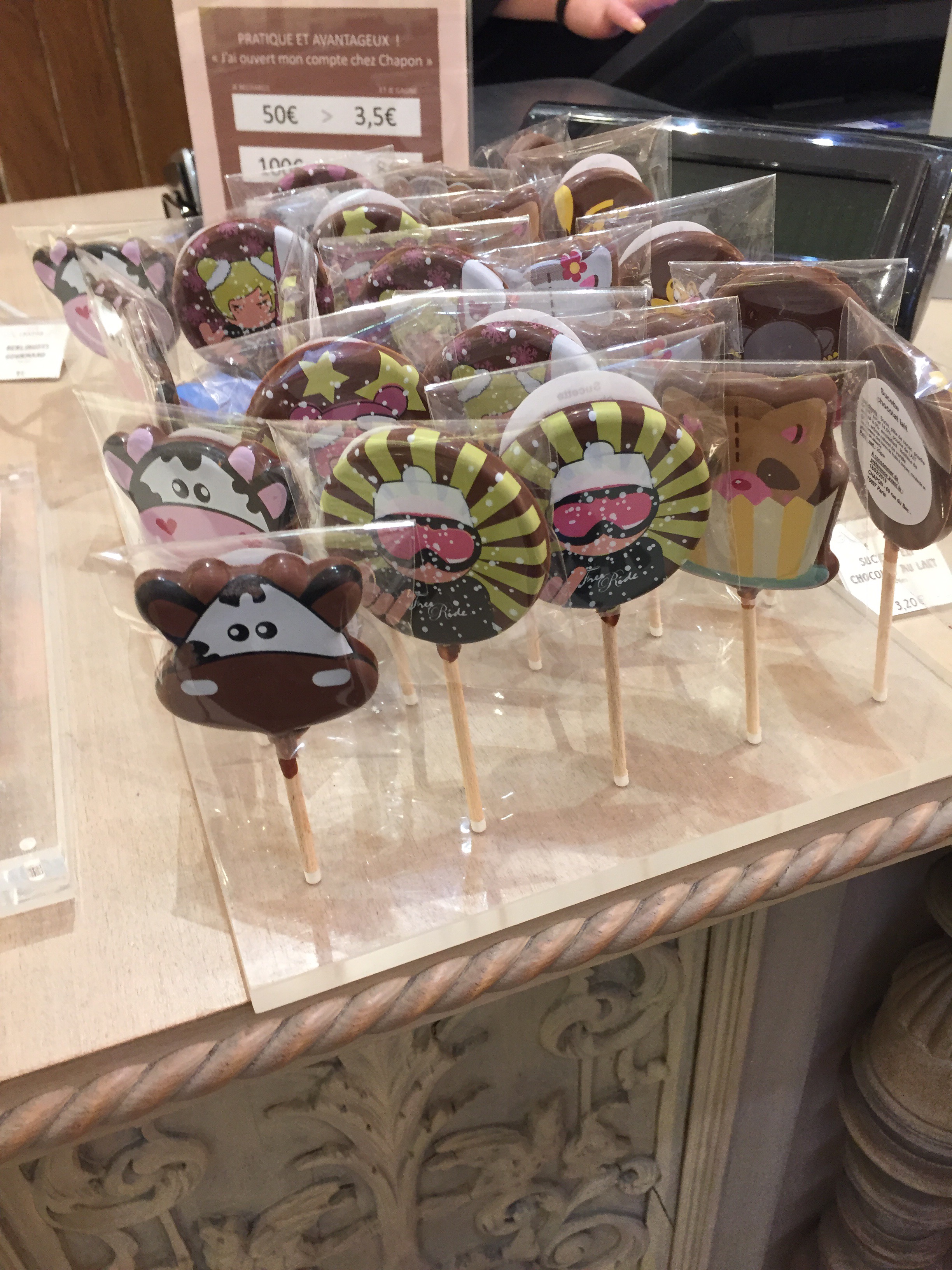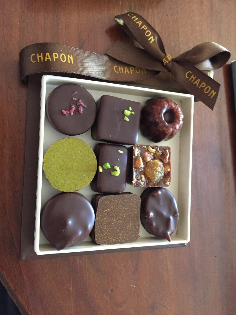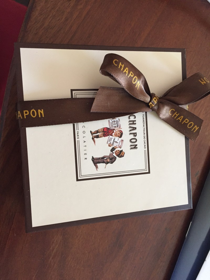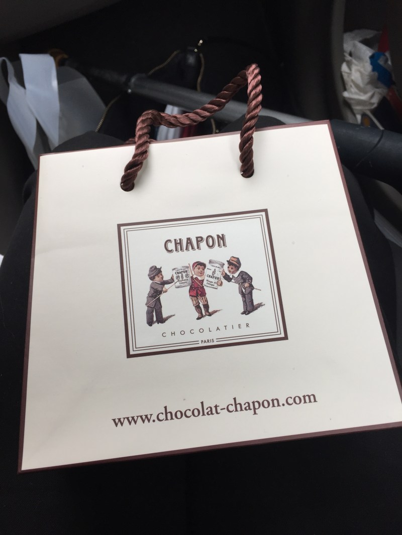 J’ai commencé par goûter Chapon parce qu’ils avaient le plus joli sac, et de la bonne taille pour la boîte de chocolats en plus.