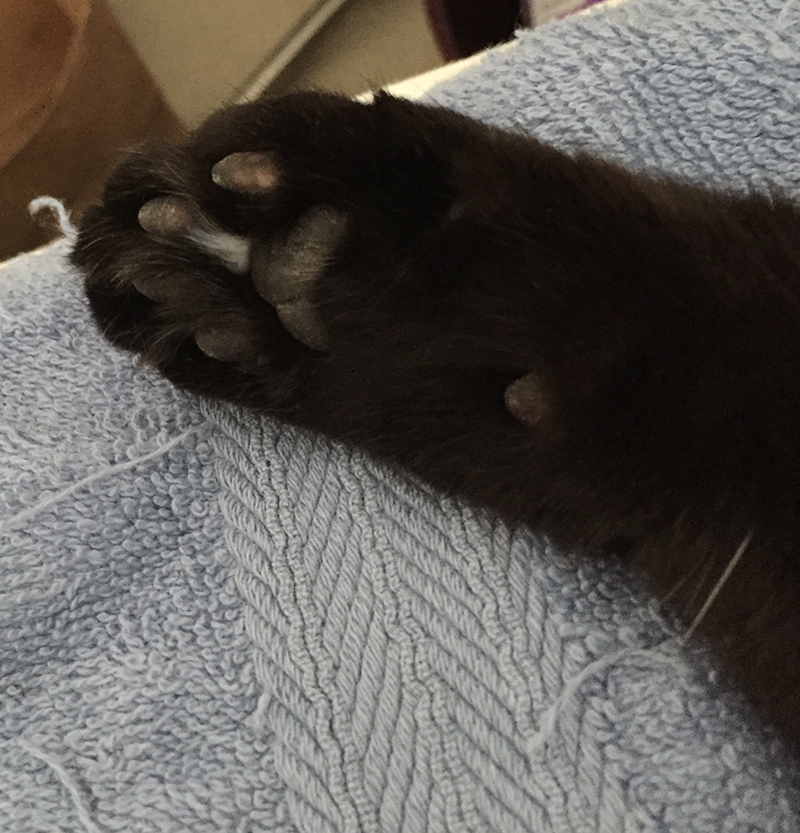 Calinette est toute noire à part pour une petite tache blanche sur la gorge et… une minuscule touffe blanche au milieu de ses petits patins au bout de la patte avant droite. J’ai bien regardé les autres pattes, leurs poils sont tous bien noirs. C’est complètement craquant!