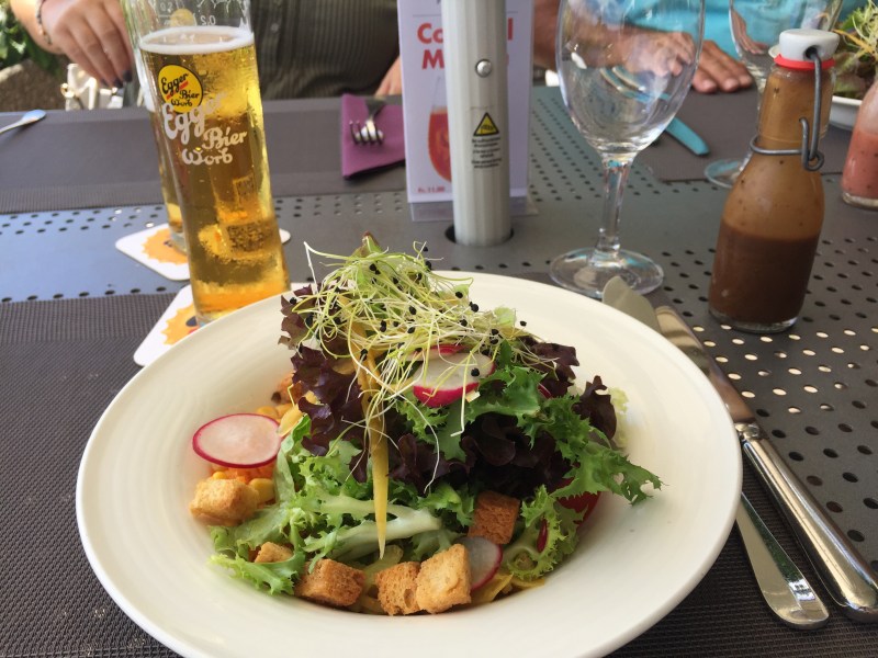 J’ai ensuite continué ma route vers le nord pour aller rendre visite à DelimOOn, blogueuse culinaire de talent, et son très sympathique mari, près du lac de Morat, dans Le Vully, une région vinicole absolument sublime que je ne connaissais pas du tout! Là, mon mal de crâne avait déjà bien empiré et j’ai demandé à DelimOOn si elle avait quelque chose contre les douleurs. Après avoir bien papoté, on est allés dans un restaurant qui avait une vue extraordinaire sur les vignobles et le lac, et on avait probablement la meilleure table du restaurant sur la terrasse! Avec une bière bien fraîche (il faisait facilement plus de 30 degrés à l’ombre), on a commencé le repas avec une petite salade… mais c’est là que les nausées ont commencé… alors j’ai annulé l’assiette de poisson du lac que j’avais commandée pour la suite… mais je me sentais de plus en plus mal jusqu’au moment où paf, heureusement qu’on était dehors, tout est ressorti! Sans bruit, pour ne pas déranger les voisins…