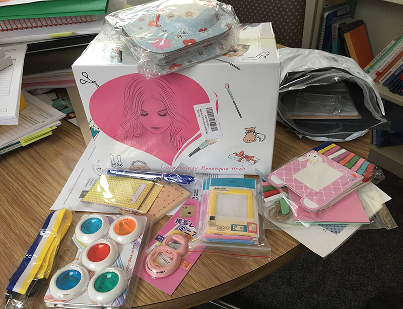 Vous auriez dû voir ma tête quand j’ai commencé à sortir tout ce chenit du paquet, une tête de mannequin à maquiller, des stylos et des petits carnets et des tonnes de trucs pour appareils photos et en japonais et que je n’ai même pas pu deviner à quoi ça pouvait bien servir… Des TONNES de trucs, exactement le genre de petits bidules que je n’achèterais JAMAIS ni pour moi ni pour mes nièces ni même pour mes pires ennemies… et ça puait le parfum, c’était l’horreur!