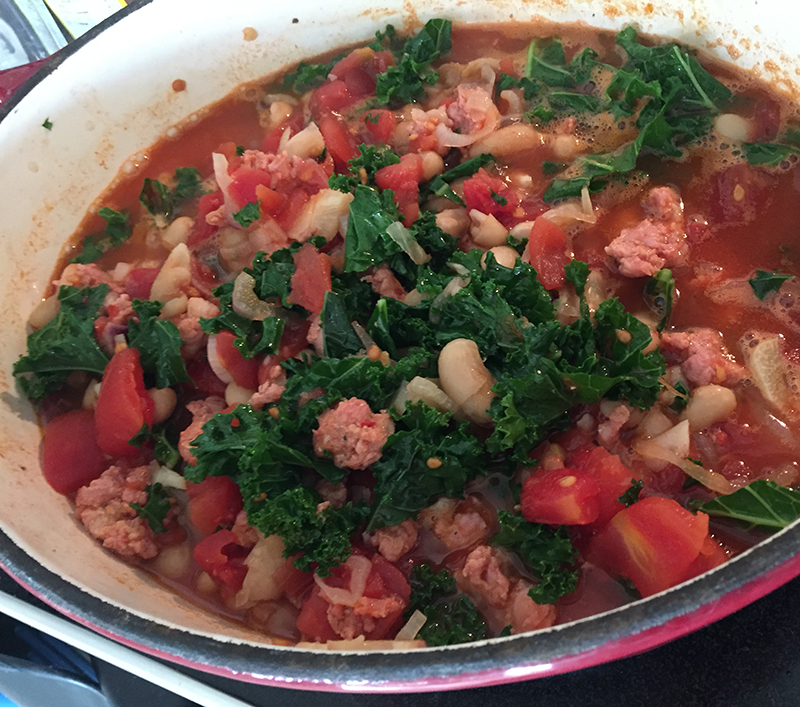 Soupe: oignon, ail, grosse boîte de tomates, saucisse italienne, kale, bouillon de légumes, haricots blancs. Réussite: je peux en manger une potée entière à moi toute seule en une soirée!