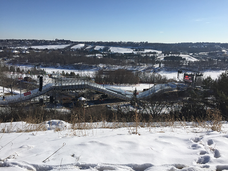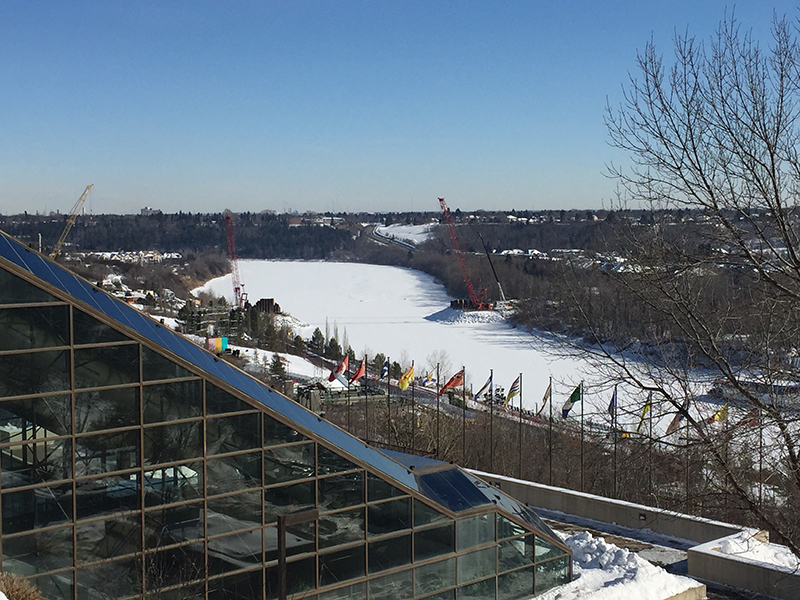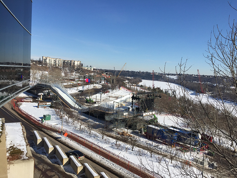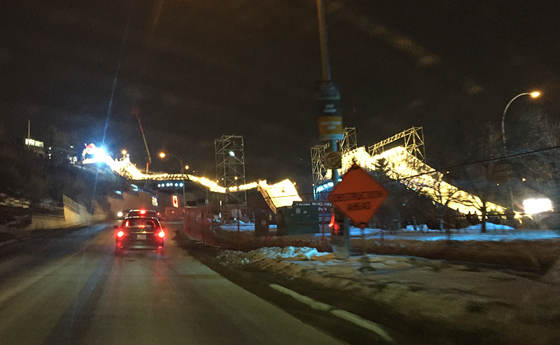 Je suis allée me balader hier pour vous prendre quelques photos du Crashed Ice, mais en fait c’était impossible de trouver un endroit d’où voir toute la descente. Ce n’est que ce soir, en rentrant tard du boulot, que j’ai pu tout voir pendant quelques secondes grâce aux illuminations… mais je n’ai pas pu le prendre en photo parce qu’il aurait fallu que j’aille de l’autre côté de la rivière, en face du bidule. J’essayerai demain soir ou samedi soir, mais ça risque d’être compliqué parce que le grand événement commence demain soir et je ne suis pas sûre de réussir à sortir de chez moi!