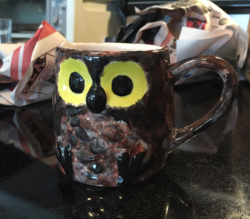 Je suis allée chercher ma chouette aujourd’hui et elle était moins moche que ce que j’imaginais. Un peu sombre et effrayante, mais pas totalement moche. Je ne suis pas sûre de la donner au petit garçon à qui elle était destinée, par contre, parce que je ne voudrais pas qu’il fasse des cauchemars…