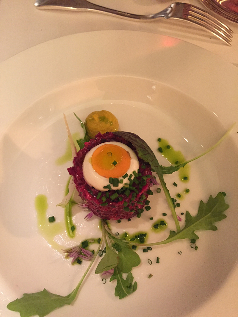 • Ce n’est pas un oeuf mais une rondelle de carotte sur un peu de crème 🙂 (nous aussi on a cru à un oeuf!) et oui, c’était bien de la betterave rouge! et la “moutarde” à côté n’était pas de la vraie moutarde non plus, c’était assez extraordinaire. Je me remets de mes émotions physiquement, mais mentalement, je crois que j’ai oublié mon cerveau dans un des hôpitaux psychiatriques de ma mère…