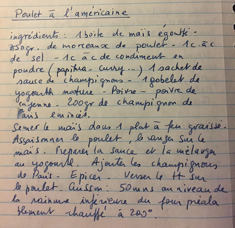 Alors j’ai eu une idée: pourquoi ne pas commencer ma “collection” avec le carnet de recettes que ma mère avait commencé à m’écrire avant mon départ de Suisse en décembre 1995? Il y a assez peu de recettes, une trentaine, peut-être, et certaines sont plus intéressantes que d’autres, mais je me suis dit que ça serait une idée marrante de vous copier ici quelques unes de ces recettes, les plus “populaires” dans la famille (ou dans mes souvenirs), et de vous proposer un petit jeu, mes chers lecteurs et chères lectrices, en l’honneur de ma môman: