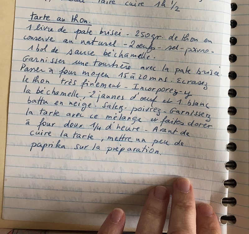 j’ai aussi un vieux cahier de recettes de ma tantine, il a au moins mon âge, et quelques recettes de ma môman, sur feuillets volants..mais je en suis qu’une cuisinière du dimanche..