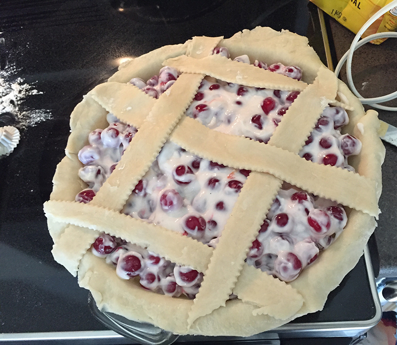 Alors je l’ai invitée chez moi pour lui apprendre à faire une pâte à tarte, en 15 minutes! Beurre, farine, eau, sel, c’est tout, franchement, il n’y a rien de plus simple! Pour le filling, on a suivi la recette de la pâtisserie locale Duchess. Et ensemble, on a fait chacune son cherry pie. Katrina a utilisé des griottes surgelées de l’années dernières, et moi j’ai utilisé les griottes que j’avais fraîchement cueillies dans son jardin.