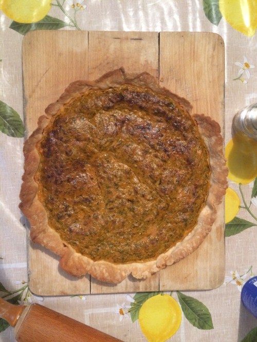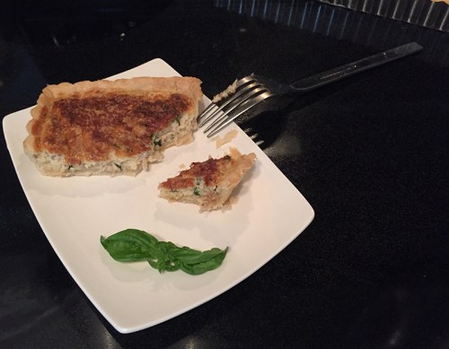 Et c’était super bon, et encore bien meilleur froid, après avoir passé un moment dans le frigo! J’avais un souvenir d’une garniture un peu sèche, quand ma mère la faisait, mais là c’était absolument délicieux et moelleux. Et j’avais peur que le basilic perde tout son goût en cuisant mais finalement non, le tout avait un délicieux goût de thon, basilic, et gruyère. Inhabituel mais délicieux! Par contre, ne me demandez pas les quantités, j’ai fait tout au pif!