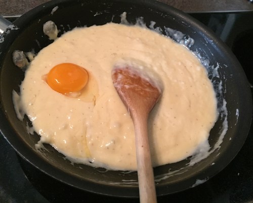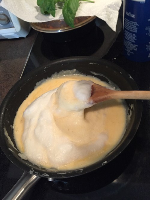 Ensuite, je voulais mettre les deux jaunes d’oeufs et monter les deux blancs en neige mais mon premier jaune s’est cassé donc j’ai mis un oeuf entier plus un jaune dans la béchamel et j’ai monté le deuxième blanc en neige et l’ai rajouté au mélange.