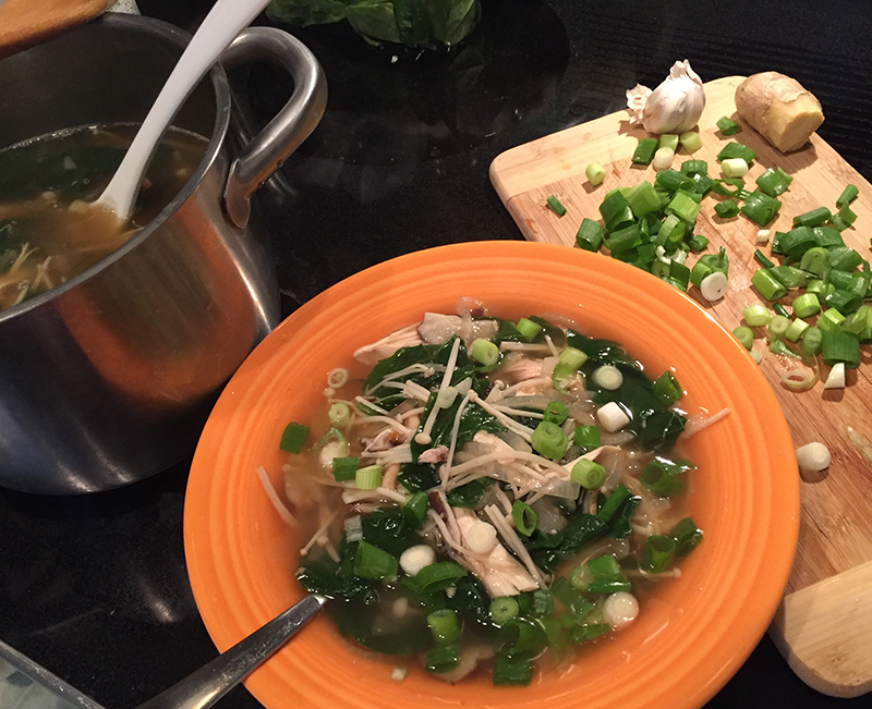 Réussite: 10/10. C’était fait en 15 minutes! En fait, la prochaine fois je ne mettrai pas de poulet, c’était inutile (c’est bien si on veut une soupe plus copieuse). L’oignon, l’ail, le gingembre, le piment, les champignons et les épinards sont suffisants pour faire un bouillon délicieusement réconfortant et réchauffant en cas de temps pourri et/ou de déprime.