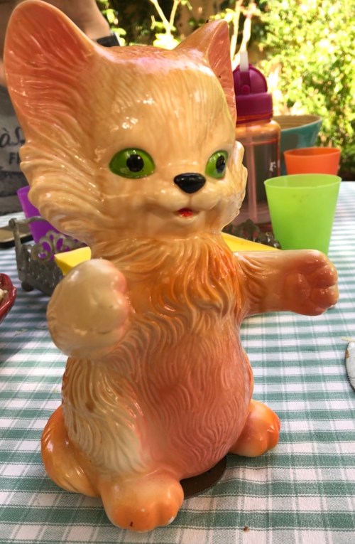 Petit chat très kitch que j’ai rencontré ce dimanche. En plus il se remonte et tourne sur lui même ! Babeth de Lille.