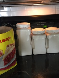 Après ma petite mésaventure de 10 kilos de la dernière fois, j’ai trouvé des pots en plastique (dans lesquels je mets normalement les pâtes, le sucre, etc. pour éviter d’avoir des sachets en papier ou plastique de toutes les tailles et qui fuient d’un peu partout, et puis c’est plus étanche aux bestioles et à l’humidité), et j’ai réussi à y mettre 9 kilos de farine. Il me restait donc un kilo, avec lequel j’ai fait de la pâte à […]