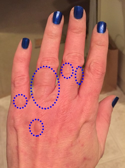 Parfois dans la vie on fait des conneries comme de préchauffer son petit four et quand on y voit quelques flammes brûler les quelques miettes restées sur le plateau on débranche le four en question et on essaye de sortir le plateau avec les quelques miettes brûlées en question sauf que ce n’était pas des miettes qui avaient pris feu mais du beurre qui avait fondu des croutes au fromage grillées le jour d’avant et comme on essaye de faire les choses rapidement avant qu’elles n’empirent le beurre fondu/brûlé/brûlant en question est brutalement envoyé sur le dos de la main et là on jure comme un charretier et on se met la main en question sous l’eau froide pendant 30 minutes et puis on garde sa main dans un saladier d’eau froide pendant quatre heures mal installée dans la cuisine et en pleurant comme une madeleine parce que putain qu’est-ce que ça fait mal et avec une pauvre Calinette terrorisée qu’on ne peut même pas aller câliner et rassurer et puis heureusement la gentille voisine anglaise est de retour de son concert et a quelques compresses et une bande et avec en plus du gel au calendula et quelques comprimés de codéine vieux comme mes chemises on arrive à mal dormir quelques heures en tombant dans les pommes à cause de brutales chutes de tension seulement deux fois en essayant d’aller faire pipi et on arrive même à aller au boulot pour son dernier jour de cours le lendemain par miracle malgré d’impressionnantes et douloureuses cloques heureusement bien protégées par le bandage de la gentille voisine anglaise.